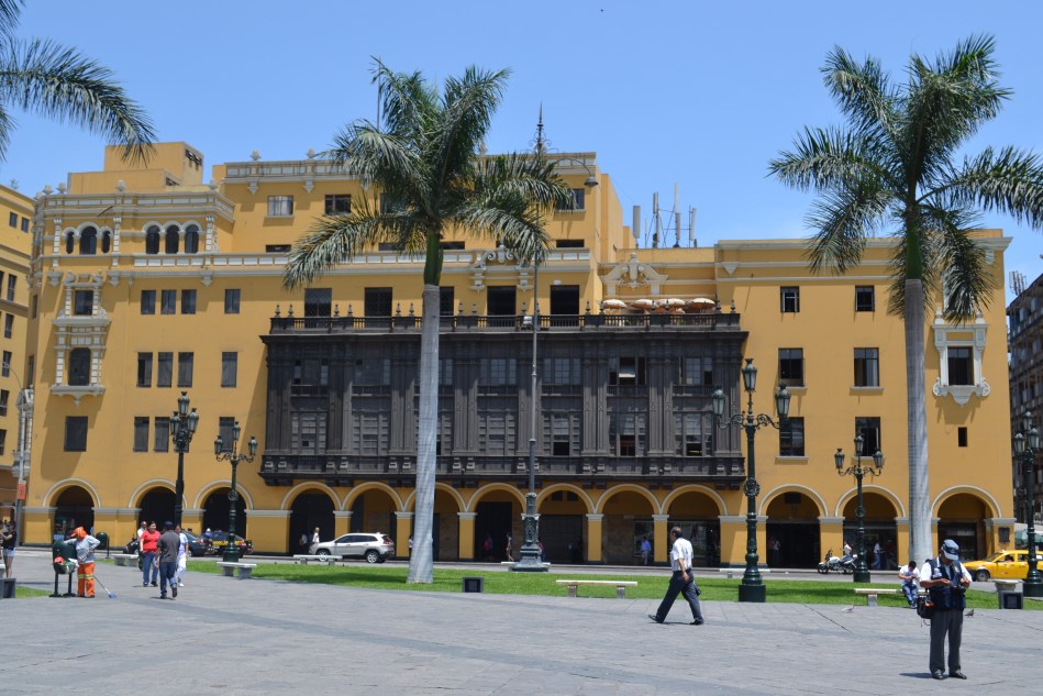 En el centro de la Plaza de Armas se encuentra una de las estructuras más antiguas del lugar, la fuente de bronce que data del año 1651. Rodea la plaza el Palacio de Gobierno del Perú, la Catedral de Lima, la Iglesia del Sagrario, el Palacio Arzobispal de Lima, el Palacio Municipal de Lima y del Club de la Unión. Recorrimos la plaza y sus alrededores pero no entramos a ninguno de los edificios, decidimos mejor apreciarlos desde afuera.