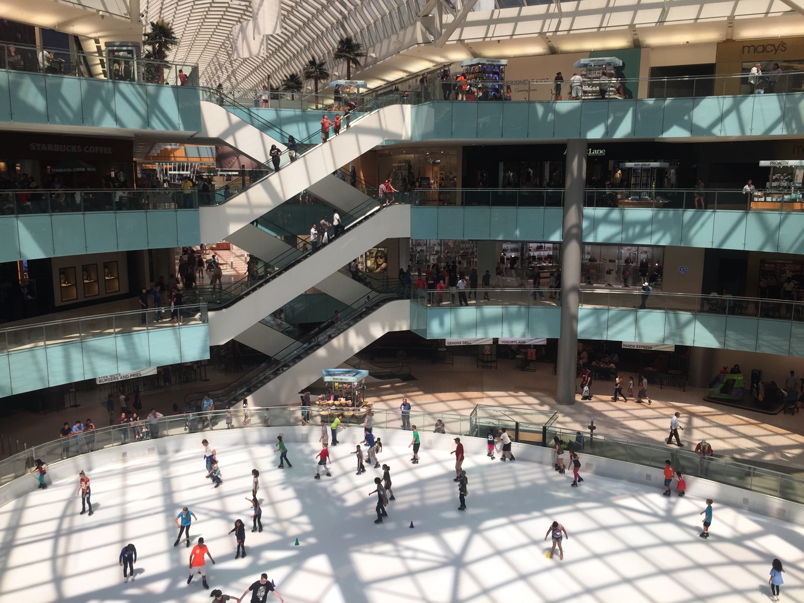 Como a la 1pm salimos de la bilbioteca y tomamos el autobús, el trolley, y hasta un Lift hasta que llegamos a Galleria Dallas. Ya para cuando llegamos a este centro comercial de 4 pisos, mis pies no daban abasto para seguir caminando. Tenia bolsas de agua debajo de ambos pies y caminar se me hacia bastante incomodo y doloroso. Si llego a saber de antemano que el centro comercial era tan grande, ni hacía el intento por ir. Lo vimos a vuelo de pajaro sin caminar mucho. Algo distintivo de este mall es que en el 1er piso tiene una pista de patinaje en hielo, así que si nunca han patinado en hielo esta es su oportunidad para hacerlo sin importar la estación del año. El techo del mall es en cristal y lo construyeron siguiendo el modelo del techo de cristal del centro comercial italiano Galleria Vittorio Emanuele II.