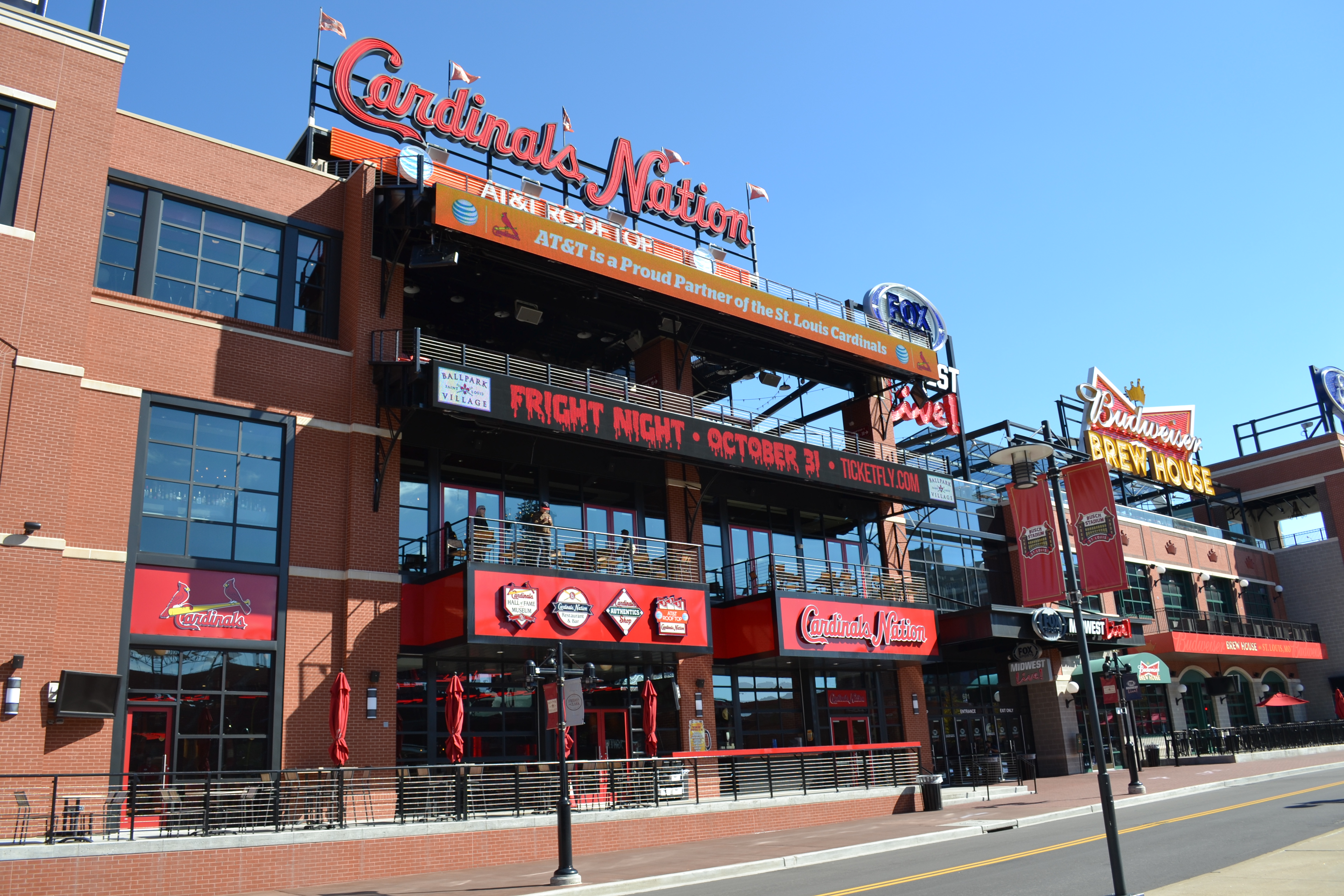 No pudimos entrar al parque, pero recorriendo los alrededores llegamos a Ballpark Village. El Ballpark Village es un centro de entretenimiento justo al lado del estadio. Allí hay restaurantes, pubs y pantallas grandes al aire libre donde transmiten los juegos, entre otras atracciones . Nosotros entramos a Cardinals Nation que es un restaurante de dos niveles, un museo y salón de la fama de los Cardenales, una tienda de souvenirs con memorabilia y tiene una azotea con sobre 300 asientos con vistas espectaculares del estadio. Nos compramos una cerveza y subimos al segundo piso del restaurante. En ese segundo piso hay unos balcones desde donde se tiene una muy buena vista del interior del parque.