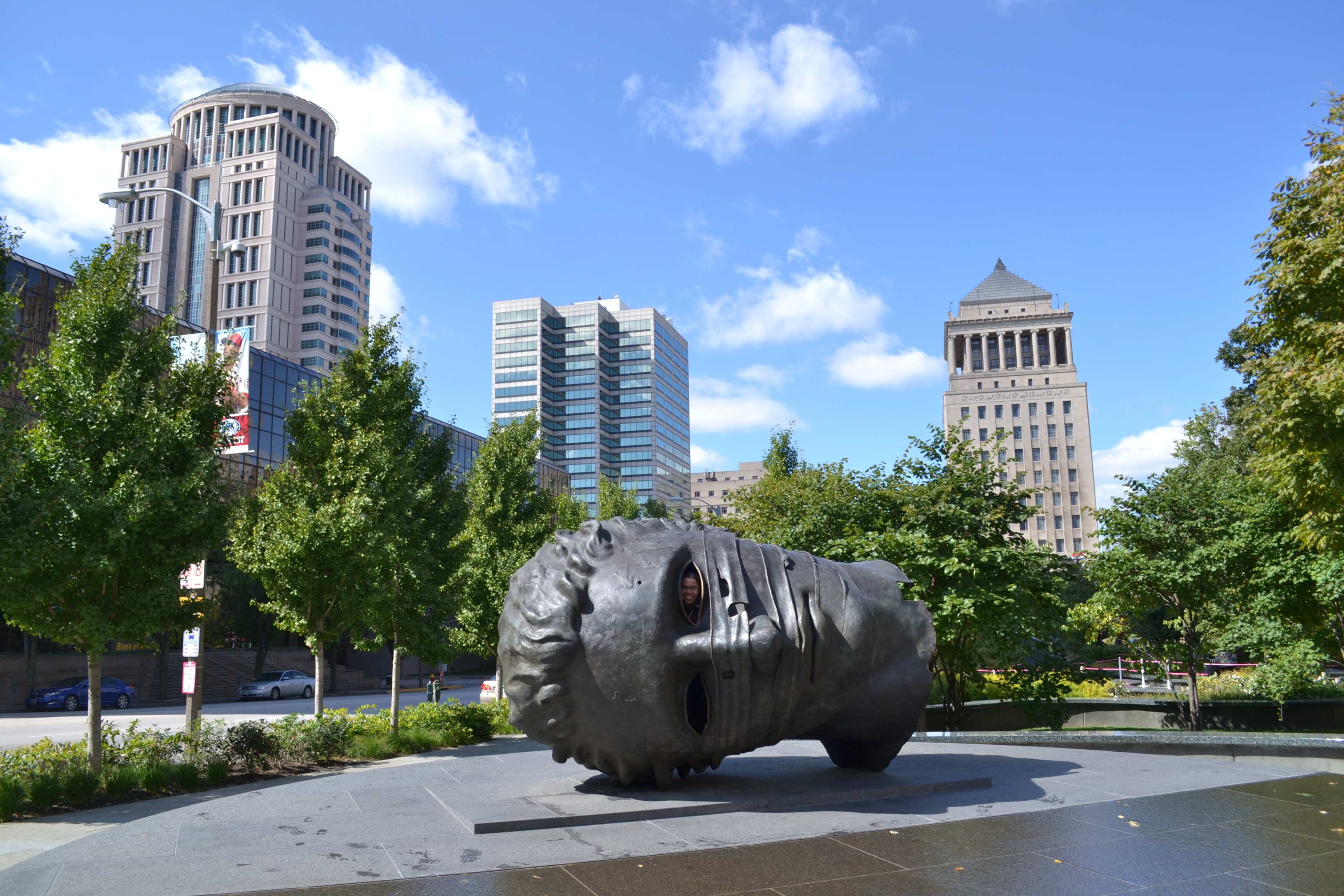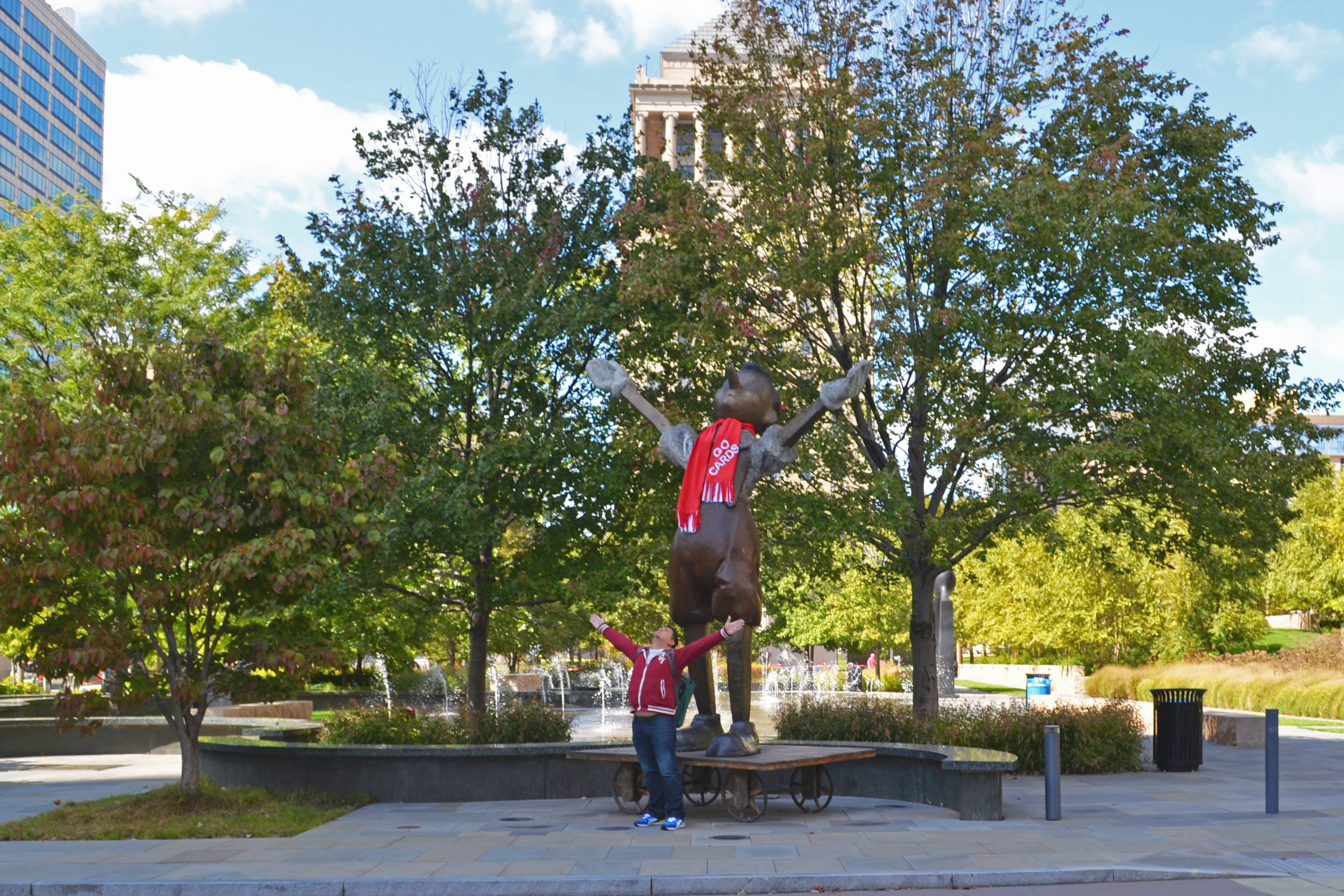 Nos terminamos la cervecita y nos fuimos caminando hacia el Citygarden que estaba a dos cuadras. El Citygarden es un parque urbano y jardín que cuenta con 24 esculturas dispersas alrededor de las dos cuadras que componen el jardín. Es un parque/jardín abierto, sin verjas, lo cual lo hace accesible por cualquier lado del parque y es libre de costo. Los visitantes pueden tocar las esculturas y hasta entrar en ellas. La escultura Eros Bendato del polaco Igor Mitoraj en una enorme cabeza de metal tirada de lado en el suelo y las personas se pueden meter dentro de la cabeza y asomar la cara por uno de los ojos. Hay dos conejos blancos del holandés Tom Claassen en los cuales te puede sentar encima para tomarte fotos. Casi todas las esculturas son en metal, pero dado que las personas pueden interactuar con ellas, presumo que requerirán de bastante mantenimiento. Otra que me gustó mucho fue la escultura de Pinocho del estadounidense Jim Dine. Demás está decir que en este jardín de esculturas estuvimos un buen rato apreciando las obras de arte y tomando muchas fotos.
