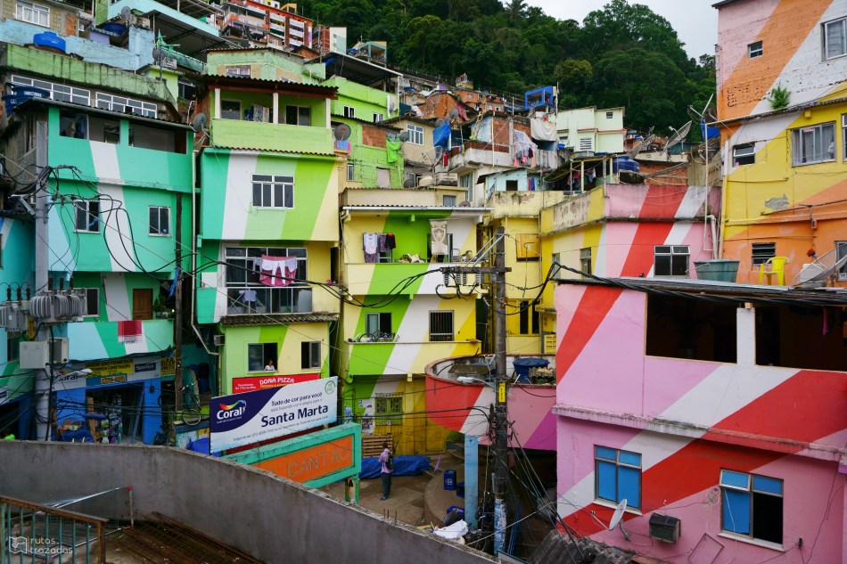 Esperamos a que escampara y procedimos a bajar la montaña. Hicimos una parada en Sindicato do Chopp donde almorzamos y nos dimos una cerveza. Al terminar tomamos un taxi y fuimos hasta la entrada de la Favela Santa Marta. Íbamos a recorrer la favela por nuestra cuenta pero un muchacho, residente de la favela, se ofreció a ser nuestro guía. Por supuesto que tenía un precio, pagamos R$50 cada uno. Hay un programa en la favela donde varios residentes son certificados por la ciudad de Rio para ser guías turísticos. Estos residentes tienen una compañía de turismo que se llama TouRio, liderada por Layos Duarte.