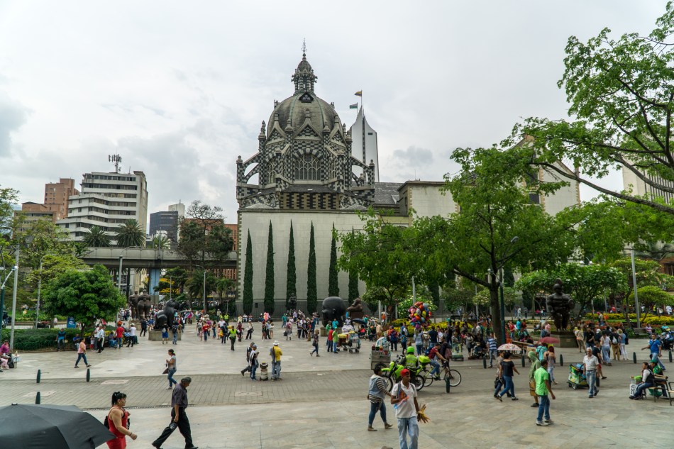 El parque, que es una plaza, estaba lleno de personas, locales y turistas, que pasaban una tarde calurosa bajo la sombra de los árboles. En el centro del parque vimos la estatua ecuestre del libertador Simón Bolívar. A un extremo de la plaza se encuentra una gran fuente que sirve como un espejo donde se refleja la Catedral Metropolitana de Medellín.