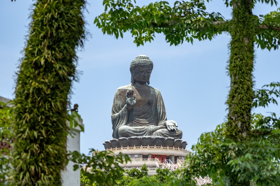 Al final del sendero llegamos a las escaleras que llevaban al Gran Buda de Lantau. Subimos los 268 escalones hasta llegar a la base del buda. Y fue en ese momento en el que me dí centa del gigantesco tamaño de la estatua. El Gran Buda es el segundo buda sentado más grande del mundo construido en bronce. Mide 34 metros (112 pies) de alto y pesa 250 toneladas. Su construcción tomó 12 años y se ubica en el punto más alto de la Isla de Lantau.