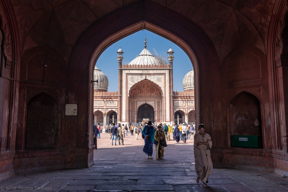 Salimos del café listos para comenzar nuestro primer día en la gran India. Caminamos hasta una calle principal y pedimos un Uber. El tiempo que estuvimos esperando por el Uber se hizo eterno porque los vendedores ambulantes no paraban de acosarnos tratando de vendernos todo tipo de producto, y no aceptan un no por respuesta. Son expertos insistiendo, al punto que incomodan y re-joden la existencia. Nos metimos en una tienda de especias con el fin de esquivar a los vendedores de la calle hasta que el Uber llegó. Nuestra primera visita del día la hicimos a la mezquita Jama Masjid. El Uber nos dejó frente a un camino peatonal que llevaba a la mezquita y al bajarnos del carro tuvimos la primera vista del enorme templo.