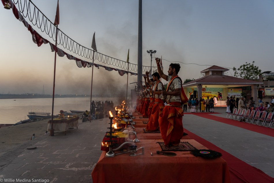 Cuando nosotros llegamos a Assi Ghat ya la ceremonia del Aarti estaba en proceso. Allí había siete muchachos ejecutando la ceremonia, elevando plegarias mientras hacían una especie de “baile” corporal moviendo unos abanicos de plumas de pavo real que tenían en sus manos. La ceremonia acabó justo antes de que amaneciera, aunque ya el cielo estaba claro, el sol aún se escondía bajo el horizonte.
