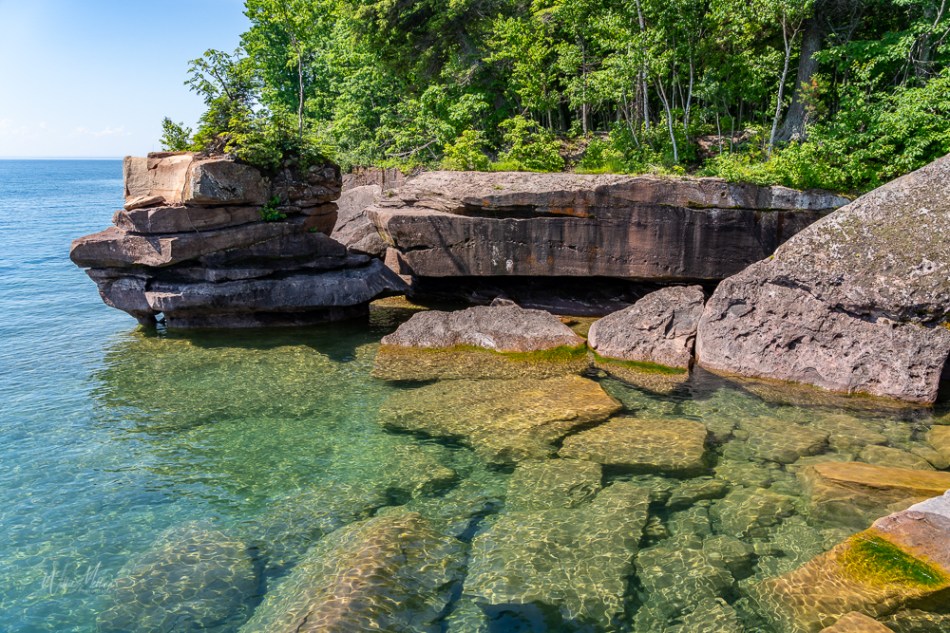Al llegar al parque me estacioné y recorrí un corto sendero que me llevó a Big Bay Point. En Big Bay Point había personas tirándose al lago desde las enormes formaciones rocosas que caracterizan la costa del Lago Superior. El agua era cristalina y se podía ver las rocas que reposaban en el fondo del lago. Fui hasta la roca, pero no me tiré al lago, no quería recorrer el parque todo mojado.