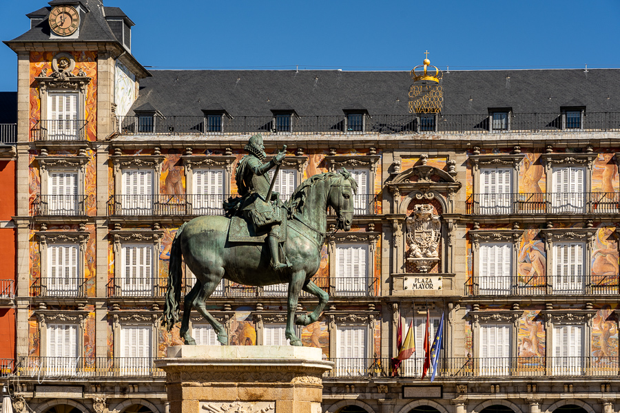 Al terminar el desayuno nos fuimos a turistear a la Plaza Mayor, mientras esperábamos al resto de nuestros amigos que su vuelo llegaba como al medio día. La Plaza Mayor es un símbolo de la ciudad. En el siglo XV, la Plaza Mayor recibía el nombre de Plaza del Arrabal, que fue sustituido por otros nombres como: Plaza de la Constitución, Plaza Real y Plaza de la República. El nombre actual se conserva desde finales de la Guerra Civil. Se trata de una plaza de planta rectangular, recorrida por soportales y edificios de ladrillo de tres plantas.