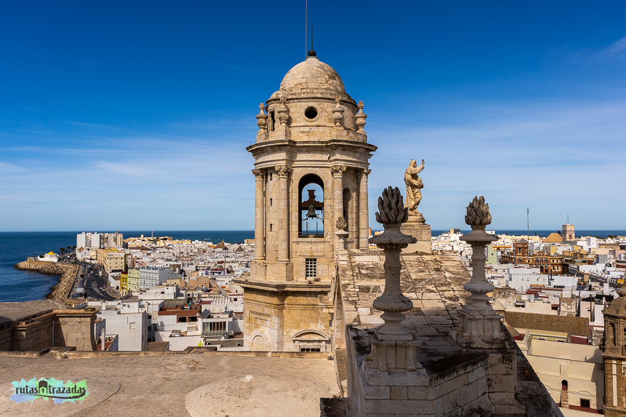 Luego nos acercamos a la Torre Tavira que es la torre vigía más alta del casco antiguo con aproximadamente 33 metros de altura sobre el suelo y 45 metros sobre el nivel del mar, y el segundo punto más alto, solo superado por las torres de la catedral, a aproximadamente 58 metros de altitud. Fue construida en el siglo XVIII y designada torre vigía oficial del puerto de la ciudad en 1778 por ser la de más alta cota, recibe el nombre de su primer vigía, el teniente de fragata Antonio Tavira. Para acceder a la torre tuvimos que pagar 8€. Para llegar al mirador subimos unas escaleras, y desde arriba tuvimos grandes vistas de la ciudad.